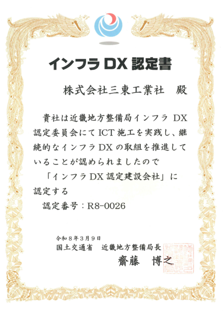 この度、弊社は国土交通省近畿地方整備局より「インフラDX認定建設会社」として認定を受けました 。