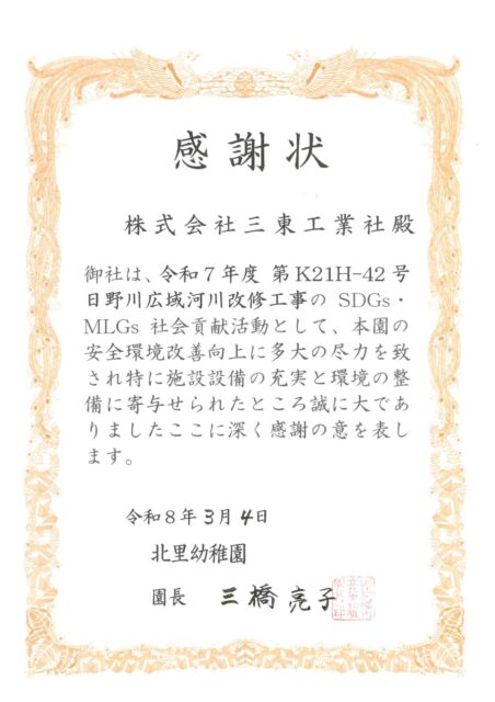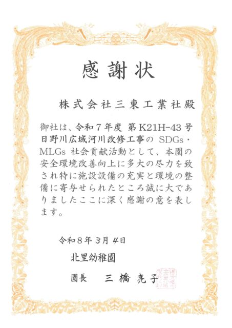 令和8年2月19日に近江市立北里幼稚園の皆様を対象に「令和7年度 第K21H-42号 日野川広域河川改修工事」「令和7年度 第K21H-43号 日野川広域河川改修工事」の現場見学会を開催いたしました。